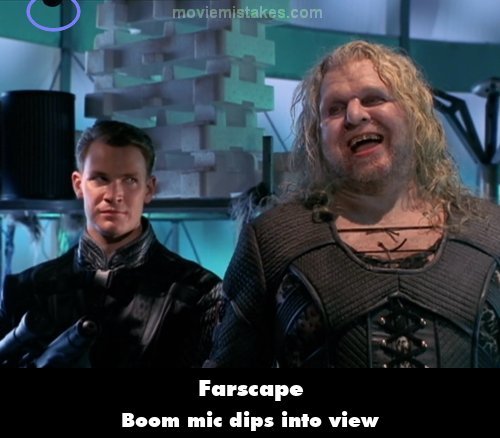 Visible crew/equipment: After Chiana and Jothee lie to Rygel about a pot that exploded which caused the mess, it cuts to the room where Scorpius and his men are holed up while looking at a hologram map of the clinic, and in the first shot facing Grunchlk and Kobrin the boom mic dips into view at the top of the screen.