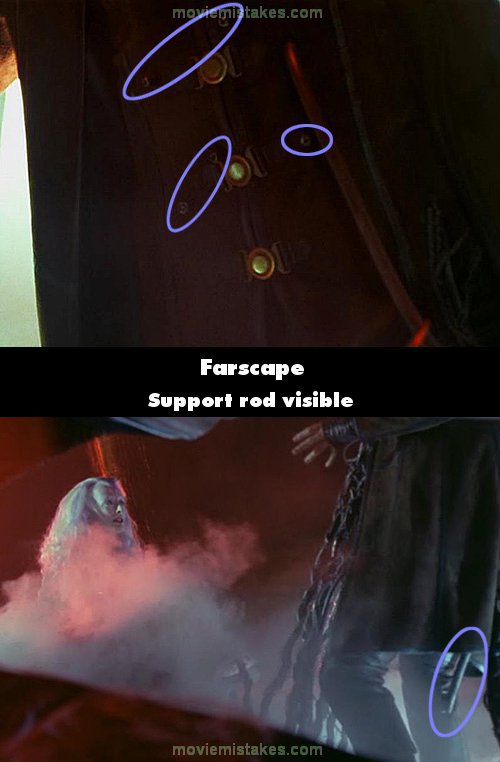 Visible crew/equipment: When Stark and Sierjna go to Talyn's rudimentary pilot's den, notice that Stark's vest has suddenly developed five randomly placed grommet openings, which will be where Talyn's wiring will attach when Talyn bonds with Stark. And when Stark-Pilot says, "Talyn you will turn away, you must turn away," there's boom movement at the right and left of the screen. Also, later when Stark-Pilot flies Talyn closer to the sun to rescue Sierjna, and once she reappears, there's a shot from behind Stark-Pilot and we can see the long rod (not Talyn's wiring) that's behind his right leg attached to his pants, which is part of the support equipment to have Stark-Pilot hover.