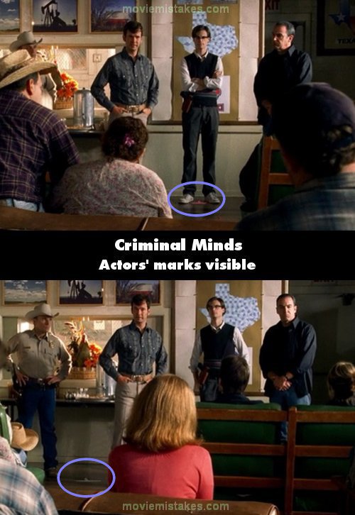 Visible crew/equipment: When James Charles, the guidance counselor, says, "It could be someone you know, or it could be a stranger you pass at the grocery store," the actors' red T-marks are visible on the floor at Reid's and Gideon's feet. Then when Charles continues to say, "gathering information on the case," we can also see the actor's white T-mark beside the counselor's feet, where he will stand after he introduces Gideon.