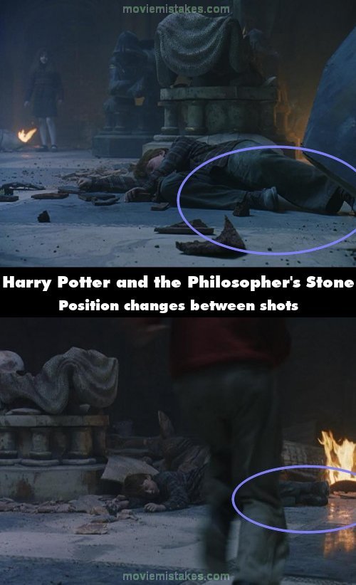 Continuity mistake: In the chess scene, when Ron falls off the horse, he is lying on his side on the floor with one knee bent so that one foot is higher than the other. When Harry and Hermione run over to check on him, one foot is on top of the other. (02:05:15 - 02:06:00)