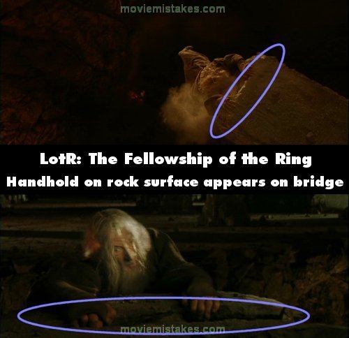 Continuity mistake: When the Balrog's whip wraps around Gandalf's ankle and pulls him off the bridge in Moria, you can see that the surface of the bridge where he was standing is perfectly flat and smooth. We cut to Frodo screaming, then back to Gandalf, who is now hanging onto an easy-to-grip groove in the rock. (00:39:45)