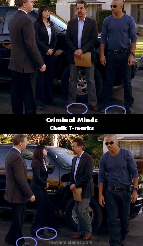 Visible crew/equipment: After the press conference, while Emily, Rossi, and Derek are standing beside the SUV, when Captain Lancaster walks over to them we can see the four chalk T-marks on the ground where they all stand.