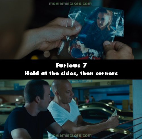 Continuity mistake: When Dom is holding the photo of Gisele, the way he holds it depends on the shot. (00:25:05)