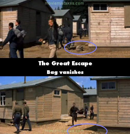 Continuity mistake: In the scene involving Hilts and his baseball directly after Sedgwick and Haynes have their sham fight, Hilts drops his canvas bag with his name on it on the ground. When Goff comes to join Hilts, however, the canvas bag is nowhere to be seen. Despite the angle it would have been seen as the bag was placed down horizontally. (00:13:35)