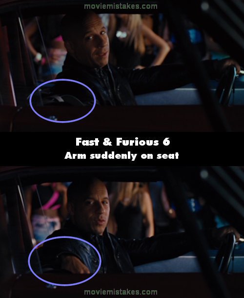 Continuity mistake: When Dom and Letty are talking on the start line ready for their race, Dom's right arm is either on the passenger seat or down depending on the shot. (01:03:20)