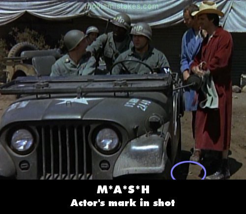 Visible crew/equipment: When Frank climbs into the jeep belonging to Major General Cornell Dickering, the MPs show up at the same time that BJ and Hawkeye walk up to join the fun, and during this scene there's a T-mark (albeit a dusty one) on the ground at the driver's side of the jeep.
