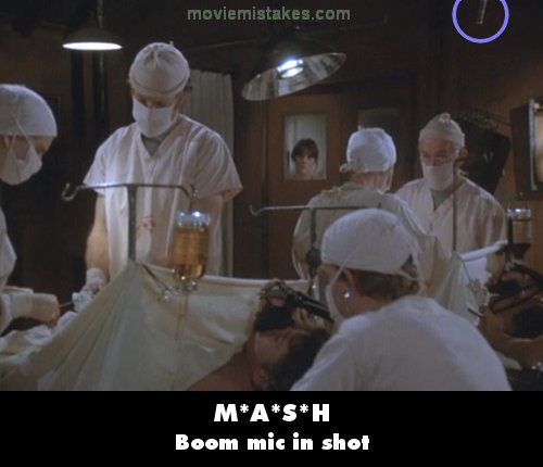 Visible crew/equipment: When they're all in the OR talking about Aggie being at the 4077, Charles compares Colonel Potter's art style to Aggie's, and in the next shot as Potter tells the art critic to tread softly, the boom mic is visible at the top, right side of the screen and just as the mic starts to pull up the shot zooms in on Aggie.
