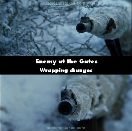 Continuity mistake: At the start, when we see a close up of Vassili's gun, you can see a big clear knot just by the barrel end, a few shots later the knot is a lot smaller and harder to see. (00:02:30)