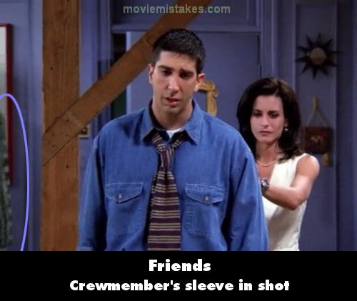 Visible crew/equipment: When Ross announces that Carol's pregnant, after Chandler says, "Kind of puts that whole pillow thing in perspective..." in the next shot of Ross and Monica we can see a crew member's sleeve at the left side of the screen. (00:07:30)