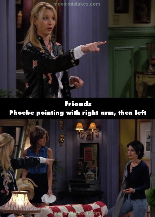 Continuity mistake: After Monica breaks the seashell lamp, when Phoebe says that she wants to believe Monica did it accidentally her right is arm up and points to Monica, but in the next shot it's Phoebe's left arm that's up while still pointing at Monica.