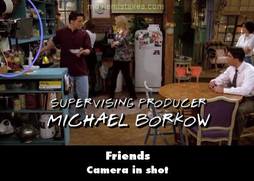 Visible crew/equipment: After the opening credits, just as Joey says that it's unbelievable Phoebe can be married, a camera and yellow electrical cord can be seen at the left side of the screen, and a bit of it is still visible in following shots when Monica mentions the cheeseburger.