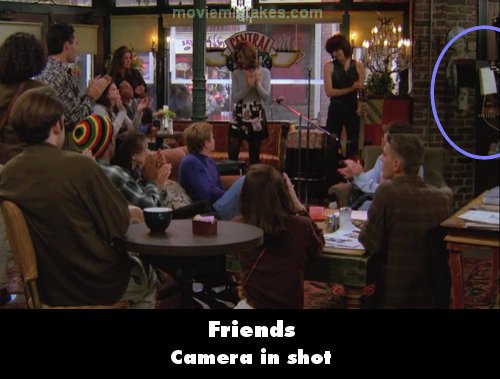 Visible crew/equipment: While Phoebe's outside Central Perk singing loudly Rachel introduces Stephanie, and just as the audience claps a camera can be seen at the right side of the screen.