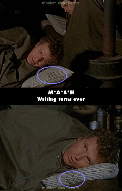 Continuity mistake: While Trapper and Hawkeye are lying on their cots, one by one everyone joins them in the Swamp, and in Trapper's closeups the "USA sterilized" that's printed on his pillow is upside down, but in the wideshots his pillow's flipped over with the print right-side up.