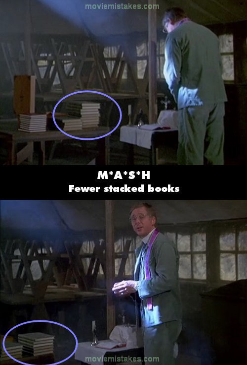 Continuity mistake: When Father Mulcahy's finishing up his Sunday service with only Klinger, who's wearing a fetching red hat, there are nine stacked books at the corner of the table, but when it cuts to Mulcahy's closeup there are now only six stacked books (which will soon be used for the 11:00 Protestant service when Trapper and Hawkeye will pray for booze).