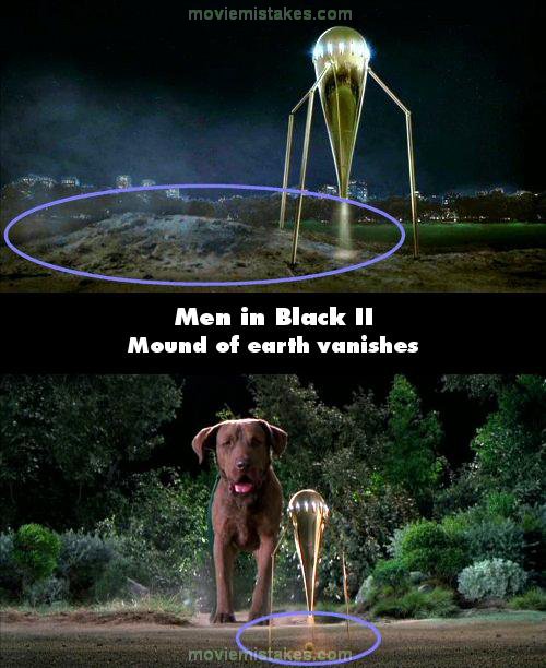 Continuity mistake: At the beginning of the movie, when Serleena first lands on Earth, her ship crashes into the ground and creates a mound of dirt. When Harvey the dog comes over to check it out, the mound is gone. (00:04:43)