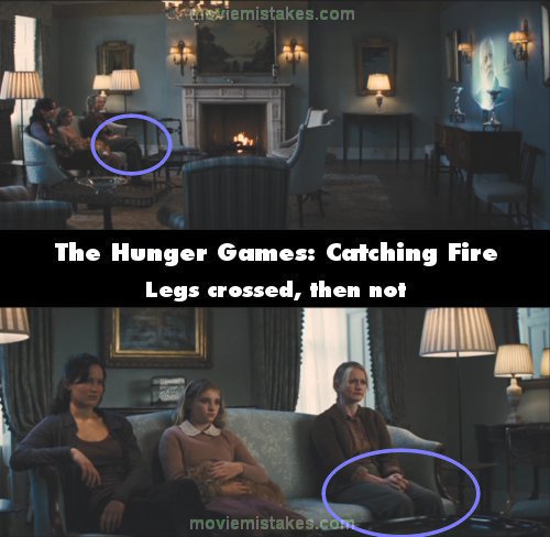 Continuity mistake: Just as President Snow starts to give his speech we see Prim, Katniss and Mrs. Everdeane sat on the sofa. Mrs. Everdeane has her legs crossed in one shot and side by side in the next. (00:43:45)