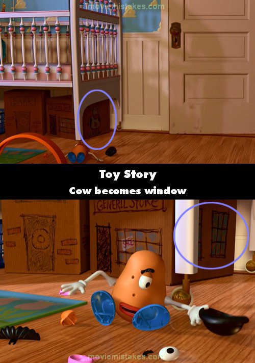 Continuity mistake: In Andy's room, the general ("generil") store box under the crib near the closet door has a cow illustration on its right side, but in the next few shots there's a drawing of two windows on that side of the box, and then it keeps switching between the cow and two windows in following shots.