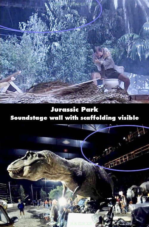 Visible crew/equipment: After Ian is thrown to the ground by the T. Rex, it cuts to Gennaro sitting in the collapsing bathroom hut, and we can see the studio soundstage set's wood scaffolding on the wall in the background, at the top of the screen (behind the scenes bonus footage shows soundstage scaffolding). More soundstage wood scaffolding, as well as netting, is visible while Alan and the kids are in the tree. This is best seen on fullscreen DVD/VHS.