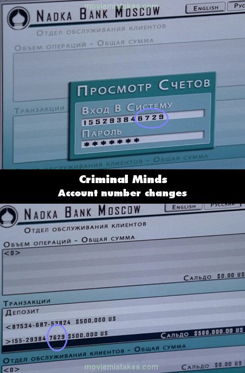 Continuity mistake: When Garcia accesses the bank's page online Prentiss gives her the account number login, 1552 9384 6729, and we see Garcia typing it correctly on the screen with the password, but when it cuts to the account's page showing deposit and balance, we see in the balance box the account number's last four digits are 7629, not 6729.