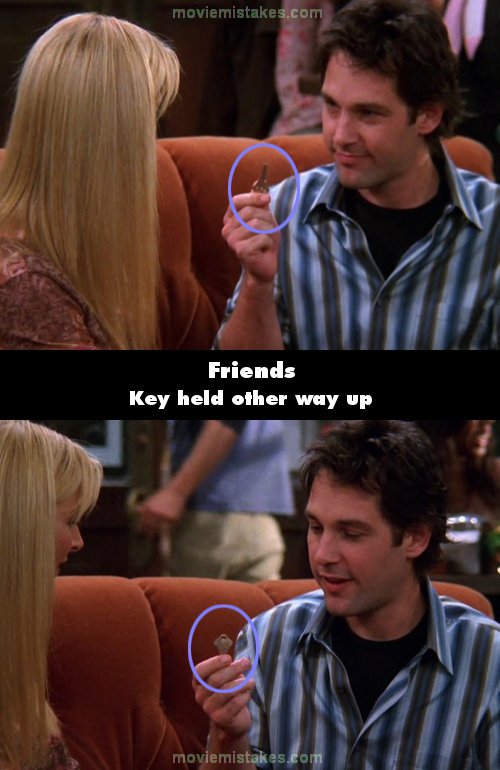Continuity mistake: When Mike and Phoebe are at Central Perk, Mike pulls his apartment key out of his pocket and he's holding the head of the key with the shank side up, but next shot he's holding the shank with the head side up.