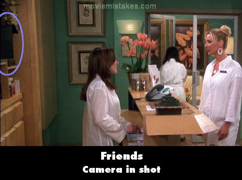 Visible crew/equipment: After Chandler tells Monica the results of the fertility tests, when it cuts to Phoebe as the receptionist says good morning to her, the camera can be seen at the left side of the screen.
