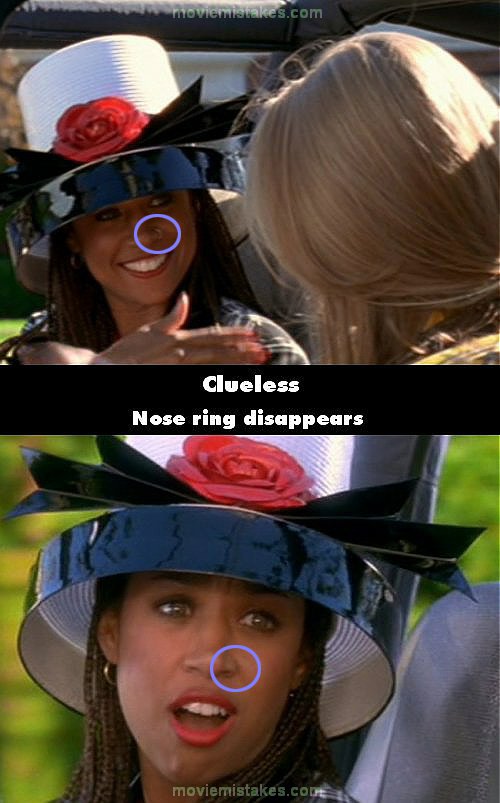 Continuity mistake: In the scene where Cher picks up Dion and they drive to school, Dion's nose ring appears and disappears with each shot. Same case for other scenes/shots throughout the film.