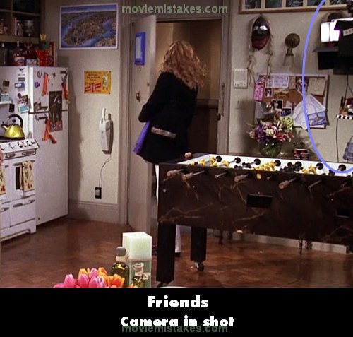 Visible crew/equipment: When Joey's in the kitchen holding a football waiting for Janine to come home, so he can talk to her about getting rid of the girly stuff, just as Janine walks into the apartment the camera can be seen at the right side of the screen.