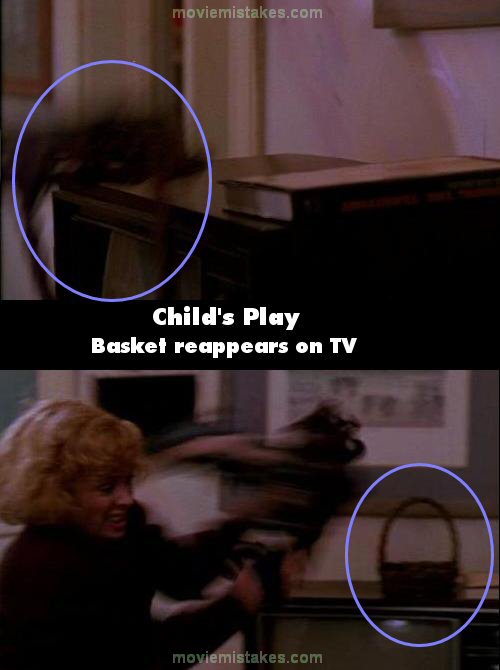 Continuity mistake: When Chucky's fried, decapitated body comes out of the vent and grabs hold of the policeman's neck, the policeman whirls around and knocks a basket and another object off of the TV. The shot goes to the other three, but when it goes back to Chucky and the cop, the items are back on the TV, untouched. (01:21:20)