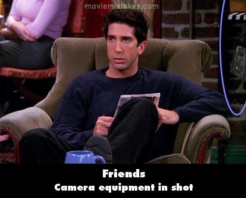 Visible crew/equipment: When Chandler points out to Joey that his oblivious comment was made in front of Ross it cuts to a closeup of Ross, and camera equipment can be seen at the right side of the screen, and it's still there in the next two closeups of Ross.