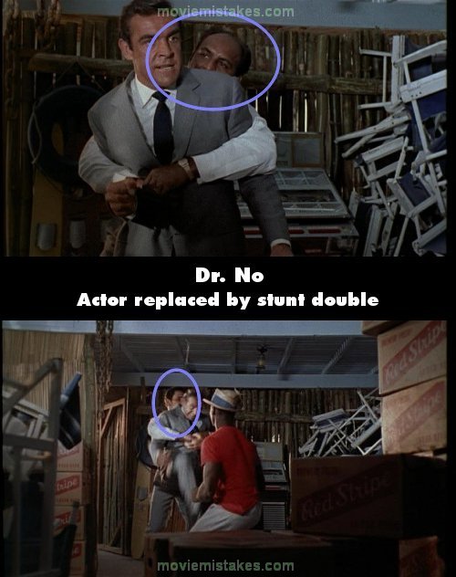 Revealing mistake: When Bond fights Quarrel and Pussfeller at the back of restaurant we can see that Pussfeller is replaced by a stunt double. (00:28:50)