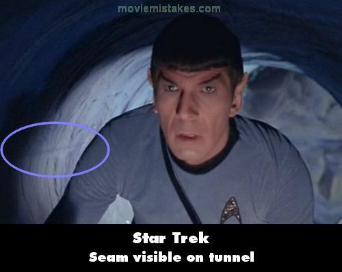 Revealing mistake: A straight and level seam connecting the top and bottom halves of the tunnel Spock is crawling through is visible.