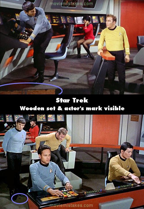 Visible crew/equipment: After the Klingon vessel's attack on the Enterprise, while returning fire just as Kirk orders to maintain firing range at 100% dispersal pattern, the set's unfinished wood plank with grey paint drip marks can be seen at the bottom of the screen. Additionally, at the end when Spock goes to stand beside Kirk's chair (also when he walks away) the actor's mark can be seen on the floor by Spock's feet.
