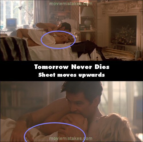 Continuity mistake: When Bond is in bed with the translator just after the title sequence, the position of the sheet of her back changes between shots. Note the gap between James' hand and the sheet. (00:21:40)