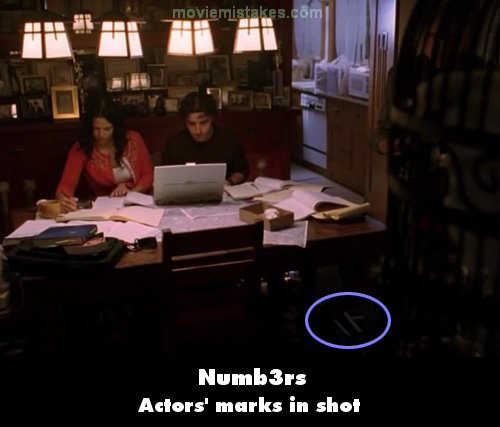 Visible crew/equipment: After Charlie tells Alan that he and Amita have a lot of work to do and that Alan's hovering over them, when Alan walks away from the table we can see the actor's tape marks on the floor where he had been standing, and also more blocking tape on the rug and kitchen floor.