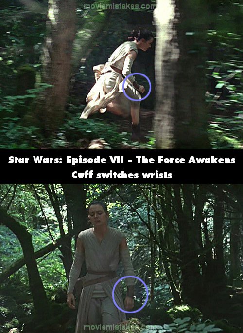 Continuity mistake: After the First Order has destroyed the Hosnian system, including Hosnian Prime, Finn rushes up to Han and asks him where Rey is, and when it cuts to the shot of Rey running in the forest it's a flipped shot - note the leather cuff is on Rey's right wrist, etc., then in the next shot the cuff is on her left wrist as it should be. (01:11:05)