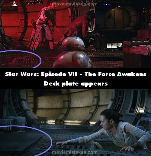 Continuity mistake: When Finn asks Rey if she can unfix the poisonous gas they rush to get the air masks, and as Finn climbs down to the maintenance bay below deck we see the floor behind Rey when she starts to kneel to help BB-8. Then after the closeup of Rey helping BB-8, in the next shot as Finn takes BB-8 from Rey we see the corner of the floor's deck plate that has suddenly appeared behind Rey, which she reaches for in the following shot to cover the maintenance bay. (00:39:45)