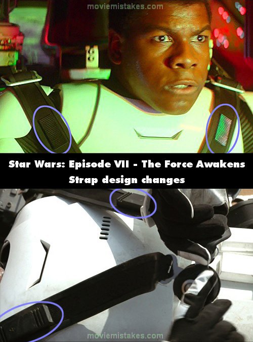 Continuity mistake: When Poe and Finn steal the TIE/SF, both of Finn's torso harness straps have thin pieces of ridged plastic attached to them - nothing else, but when Finn wakes up on Jakku those pieces attached to the straps are entirely different. (00:20:45 - 00:24:00)