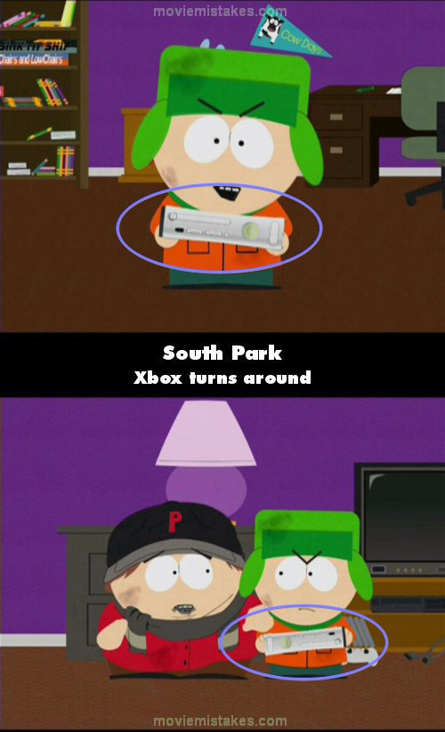Continuity mistake: The way Kyle holds the Xbox 360 changes between shots. In one shot the green circle is in his left hand, but from the side, the green circle is in his right hand. (00:13:20)
