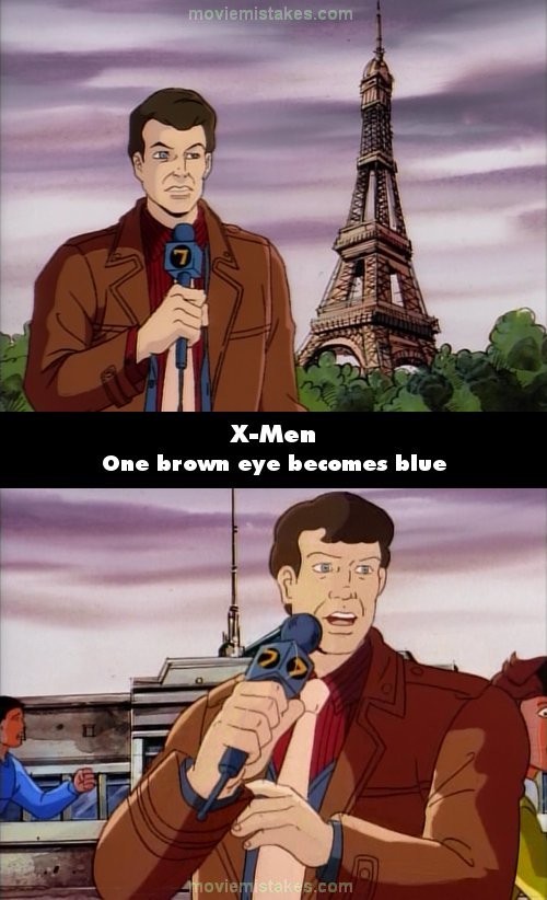 Continuity mistake: When the news reporter is first shown talking about the World Peace Conference, he has one blue eye and one brown eye. For all remaining shots he is in, both of his eyes are blue. (00:07:40 - 00:08:35)