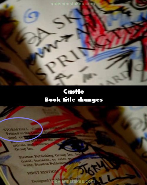 Other mistake: Beckett and Co are in the mental patient's apartment. She opens one of Castle's novels. The title page says that it's called "A Skull at Springtime." However, on the opposite page, it says that the book is "Storm Fall." (00:19:50)