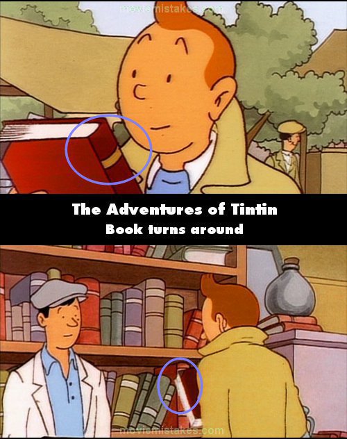 Continuity mistake: Tintin picks up a red book at the market which he states is a new one. At this moment, he is holding the book with the front cover facing Tintin. The shot then changes to a shot from behind Tintin, showing him paying for the book, where it switches to the back cover facing him. (00:02:15)