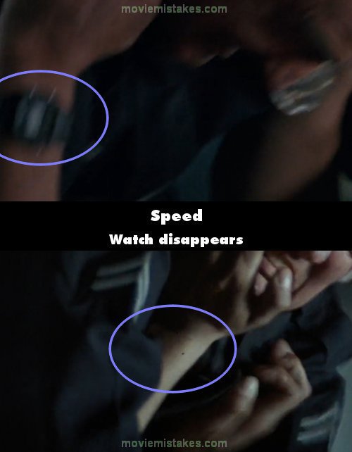 Continuity mistake: Near the end of the film when Keanu Reeves and Dennis Hopper are wrestling on top of the subway, if you watch Keanu's left wrist you notice he is wearing a watch. Yet throughout the scene it is obvious that the stunt double has no watch, because in the extreme action scenes, there are no signs of it anywhere on his wrist.