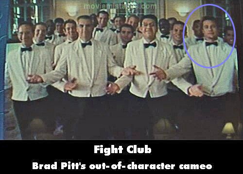Trivia: As The Narrator is watching the promotional hotel video in his suite, an army of white-jacked servants come on screen to welcome the guest to their happy place of business. Front row, far right happens to be Brad Pitt. This is in no way to further the plot, it was just a silly inclusion that no one seems to catch (as states Pitt on the DVD commentary). (00:20:17)