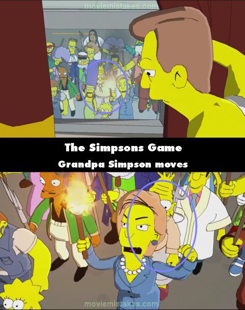 Continuity mistake: Mob Rules: When Mayor Quimby and the games producer first see the mob, there is a senator standing near the front. Grandpa Simpson is in the crowd behind the senator to her left. The shot cuts to a closer shot of the senator, and Grandpa Simpson is now directly behind her.