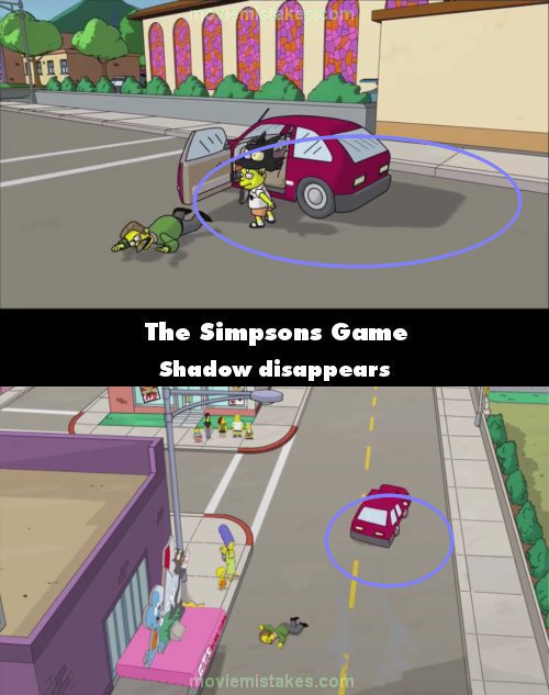 Continuity mistake: Mob Rules: When Martin Prince carjacks Ned, the shot of Ned being thrown out of the car shows the car having a shadow. The shot changes to an overview angle of Martin driving away, and the car's shadow has vanished.