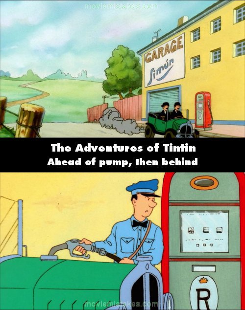 Continuity mistake: When Thomson and Thompson arrive at the garage, they park their car directly facing the gasoline pump. A couple of shots later, as the mechanic goes to fill their car, the car has suddenly moved back a few feet, and the pump is mostly ahead of the car. (00:01:20)