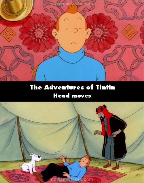 Continuity mistake: When Tintin wakes up in Bab El Ehr's tent, there is a flower pattern on his left and one on his right. When he gets up, they are no longer beside him. (00:09:25)