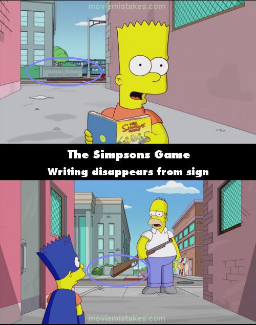 Continuity mistake: Bartman Begins: When Bart is reading the manual, there is a 360 degree panning shot of him reading. When the shot is on the road behind him, there is a museum in the background and a sign saying "Springfield Museum of Natural History." A few seconds later, when Homer arrives, the sign in front of the museum is still there, but the name has vanished from the sign. When Homer and Bart climb into the sewer, the name has suddenly reappeared on the sign.