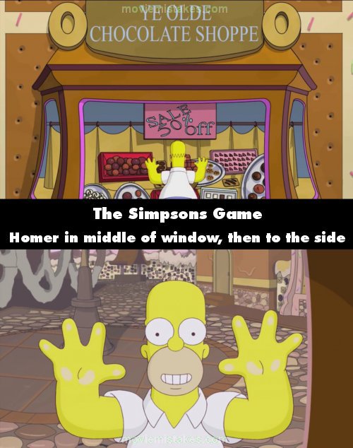 Continuity mistake: The Land of Chocolate: When Homer looks into the window of the Ye Olde Chocolate Shoppe and looks at the half price chocolate, he walks over to the window and stands in the centre of it, but in the next shot, he is suddenly standing at the corner of the window as the window frame is visible beside him.