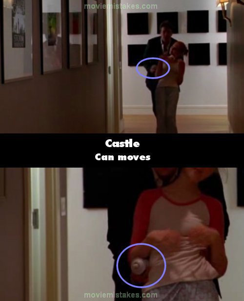 Continuity mistake: Alexis is trying to get her father to tell her how the interview with the police went as Castle playfully pushes her along the corridor. Castle is holding the bottle of whipped cream in his right hand with the bottle positioned above his daughter's elbow. Cut to the immediate next shot and the bottle is now underneath Alexis' elbow. (00:10:20)